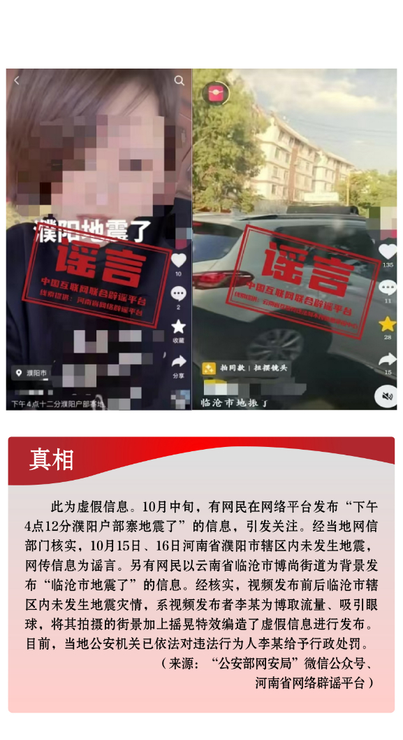 危言聳聽(tīng)炒作話(huà)題。個(gè)別網(wǎng)民和自媒體編造虛假信息,炒作社會(huì)熱點(diǎn)話(huà)題,并配以具有煽動(dòng)性、誤導(dǎo)性的標(biāo)題,擴(kuò)散傳播,擾亂社會(huì)秩序。10月中旬,新疆喀什、阿克蘇地區(qū)相繼發(fā)生地震,部分自媒體罔顧事實(shí),利用AI技術(shù)拼湊網(wǎng)絡(luò)舊圖,編造完全與事實(shí)不符的地震廢墟或?yàn)?zāi)后救援圖片,混淆視聽(tīng),嚴(yán)重誤導(dǎo)網(wǎng)民。另有個(gè)別網(wǎng)民將拍攝的街景加上搖晃特效,惡意杜撰云南發(fā)生地震,引發(fā)公眾恐慌,造成不良影響。還有網(wǎng)民為給網(wǎng)店?duì)I銷(xiāo)引流,利用家長(zhǎng)們高度關(guān)注兒童安全話(huà)題的心理,無(wú)中生有編造“四川巴中頻繁有青少年失蹤”謠言,引發(fā)公眾焦慮恐慌。