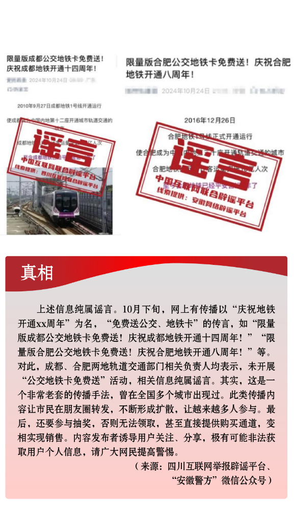 假冒官方虛構(gòu)政策。一些不法分子冒充權(quán)威機(jī)構(gòu),散布涉公共政策類(lèi)謠言,誤導(dǎo)公眾認(rèn)知。有的假借官方名義,偽造政策文件,實(shí)則行騙牟利,侵犯群眾利益。如有人利用公眾對(duì)“大數(shù)據(jù)”“數(shù)字經(jīng)濟(jì)”等內(nèi)容的認(rèn)知盲區(qū),假借“國(guó)家數(shù)據(jù)局”“中國(guó)人民銀行數(shù)字貨幣研究所”等官方名義,偽造政策文件,謠稱(chēng)“國(guó)家數(shù)據(jù)局頒發(fā)‘個(gè)人數(shù)據(jù)資產(chǎn)擁有權(quán)確權(quán)憑證’”“數(shù)字人民幣平臺(tái)將發(fā)放‘?dāng)?shù)字資產(chǎn)紅利’”,相關(guān)部門(mén)均已發(fā)布辟謠聲明。有的從公開(kāi)發(fā)布的政策信息中摘取碎片化信息,斷章取義,對(duì)政策歪曲解讀。如個(gè)別自媒體故意混淆“個(gè)人養(yǎng)老金”與“基本養(yǎng)老金”的概念,傳播“領(lǐng)取養(yǎng)老金要繳3%個(gè)稅”“養(yǎng)老金個(gè)稅起征點(diǎn)為5000元”等不實(shí)信息,引發(fā)公眾誤解。另有“成都、合肥等地免費(fèi)送公交地鐵卡”謠言,以“免費(fèi)”“贈(zèng)送”為噱頭,誘導(dǎo)用戶(hù)關(guān)注、分享,最終可能導(dǎo)致用戶(hù)遭受個(gè)人信息泄露或其他不法侵害。