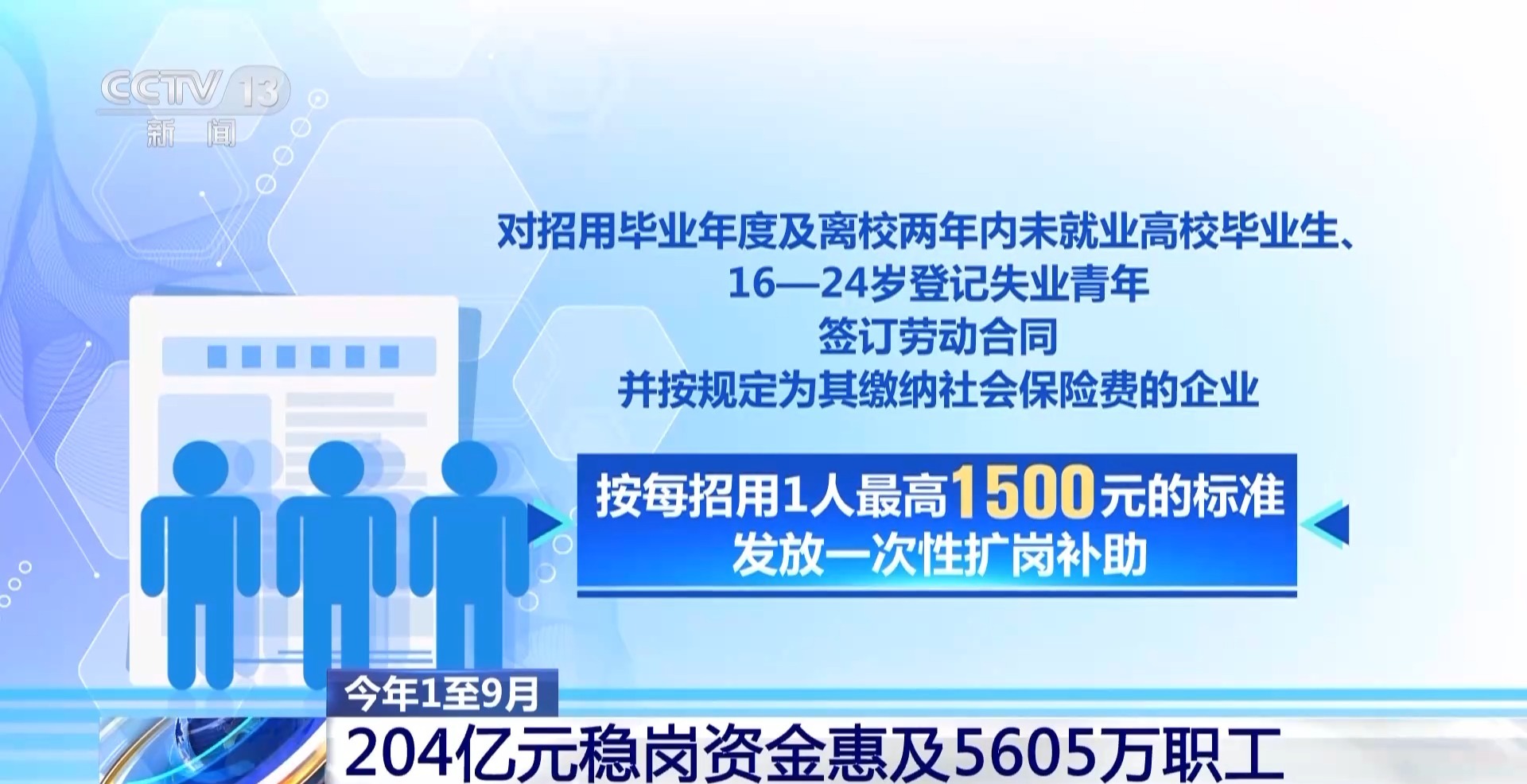 對招用畢業(yè)年度及離校兩年內(nèi)未就業(yè)高校畢業(yè)生、16到24歲登記失業(yè)青年,簽訂勞動合同,并按規(guī)定為其繳納社會保險費的企業(yè),按每招用1人最高1500元的標準發(fā)放一次性擴崗補助,今年以來已向17萬戶企業(yè)發(fā)放9億元,惠及62萬高校畢業(yè)生等青年群體。