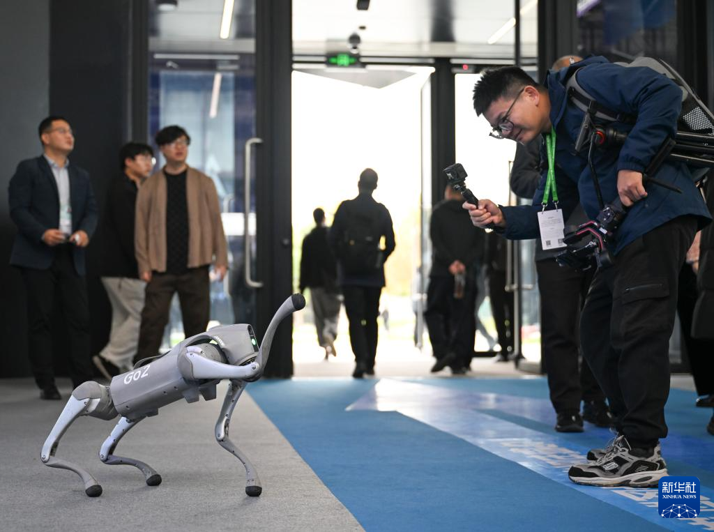 11月19日,在2024年世界互聯(lián)網(wǎng)大會“互聯(lián)網(wǎng)之光”博覽會上,參觀者與一款智能機器狗互動。