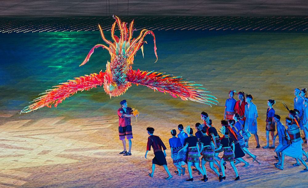 開(kāi)幕式上,黎族民間傳說(shuō)中的“甘工鳥(niǎo)”銜來(lái)金色稻穗,一幅農(nóng)耕圖景隨之徐徐展開(kāi)。