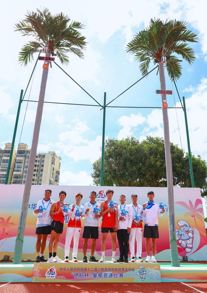 11月24日,獲獎(jiǎng)選手在頒獎(jiǎng)儀式上合影。當(dāng)日,第十二屆全國(guó)少數(shù)民族傳統(tǒng)體育運(yùn)動(dòng)會(huì)攀椰競(jìng)速男子9米決賽在西南大學(xué)三亞中學(xué)體育場(chǎng)舉行。新華社記者 楊植森 攝