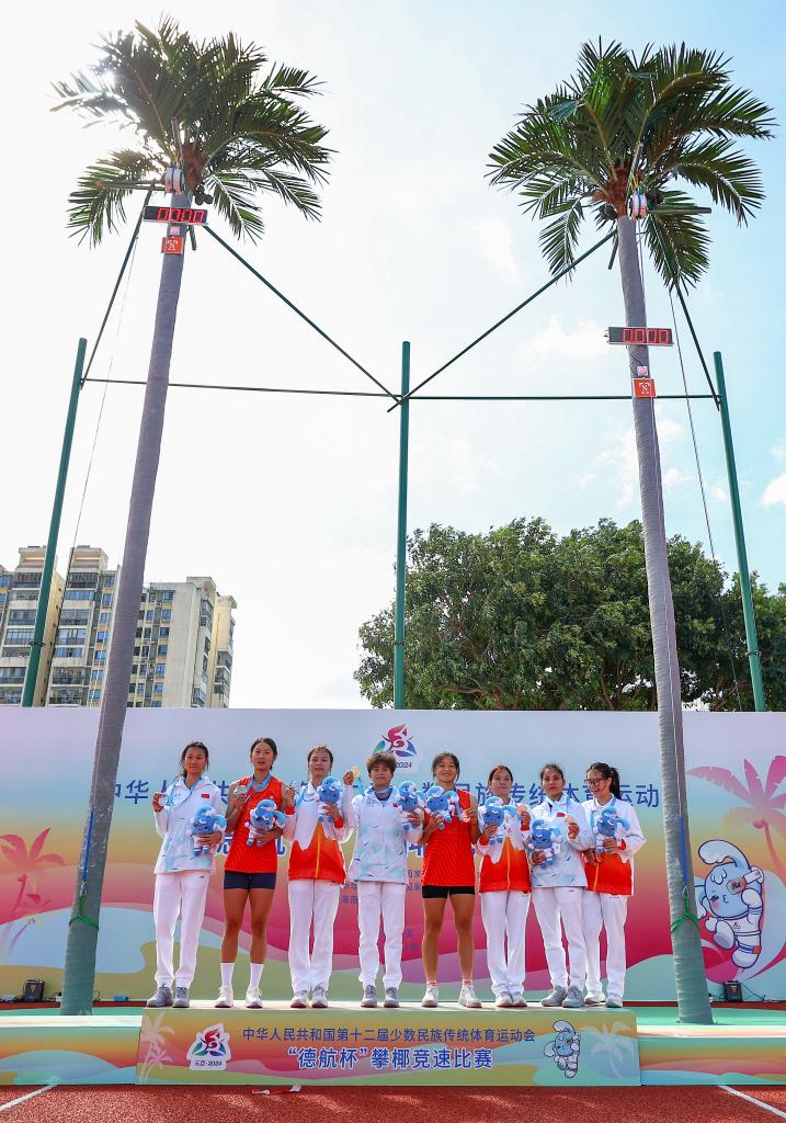 24日,第十二屆全國(guó)少數(shù)民族傳統(tǒng)體育運(yùn)動(dòng)會(huì)攀椰競(jìng)速比賽結(jié)束爭(zhēng)奪,海南隊(duì)的羅軍和符詩(shī)軍分獲男子、女子一等獎(jiǎng)。