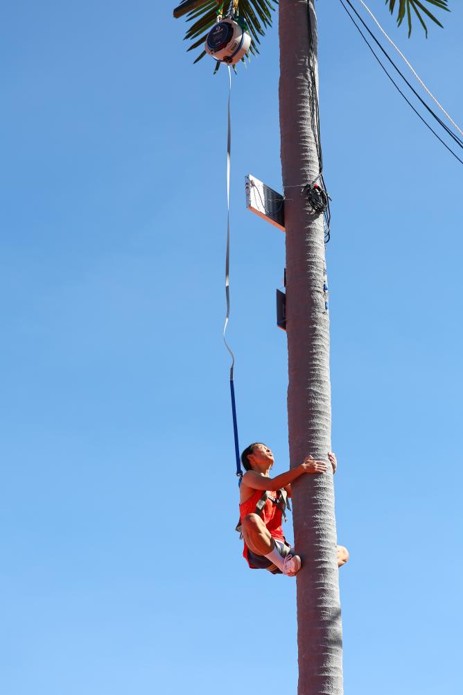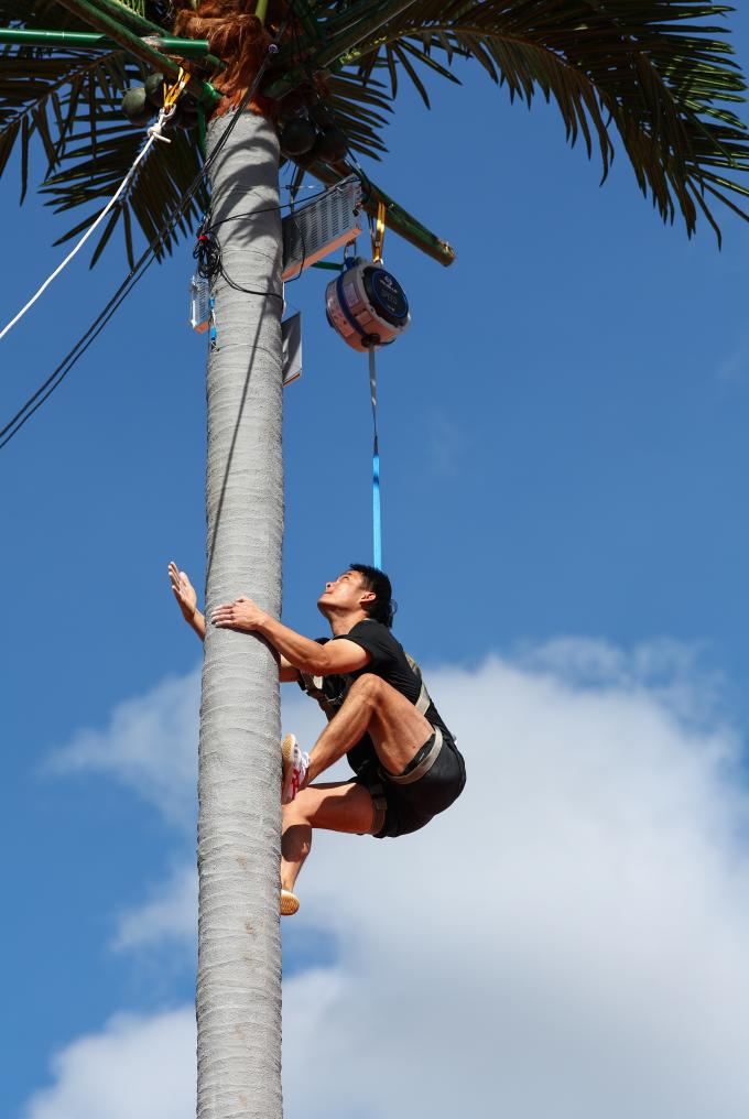 這項(xiàng)起源于海南群眾摘椰勞作的比賽既像沒(méi)有巖點(diǎn)的速度攀巖,又像垂直騰躍的跑酷。比賽中,運(yùn)動(dòng)員在9米(女子7米)的人造椰樹(shù)上攀爬,“樹(shù)干”筆直,六七秒之間便已決出勝負(fù),扣人心弦的比賽令觀眾發(fā)出潮水般的歡呼。