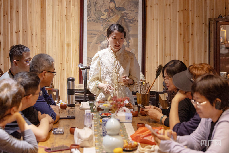 在倒扒獅街,“90后”安慶姑娘秦無顏是一家文化主題會館的主理人。在她的會館里,檀木、玉石等制作而成的新中式文玩飾品、傳統(tǒng)工藝面料制作而成的“新中式”服裝、古色古香的“新中式”茶館,定期舉行的雅集活動……無一不體現(xiàn)著獨特的東方美學。2020年,在上海從事珠寶設(shè)計工作的她返回家鄉(xiāng)經(jīng)營起這家文化空間。“既逐新,也尋根。”她希望,客人來到這里,放慢腳步,在交流與體驗中感受傳統(tǒng)文化的魅力,豐富精神體驗。