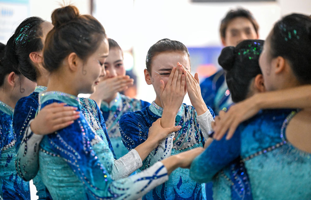 11月28日,上海隊(duì)教練韓春英(中)在成績公布后擁抱隊(duì)員激動落淚。最終,上海隊(duì)獲得二等獎(jiǎng)。