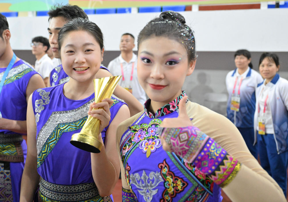 11月28日,西藏隊(duì)運(yùn)動員慶祝團(tuán)隊(duì)獲得民族健身操自選套路(輕器械)一等獎(jiǎng)。