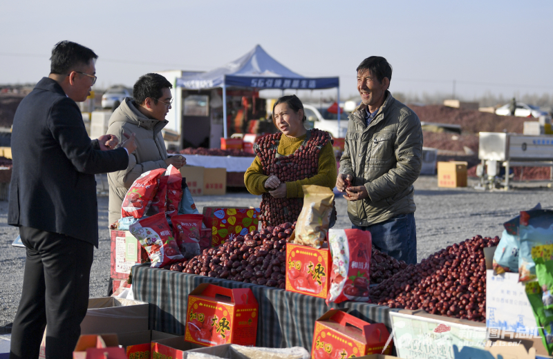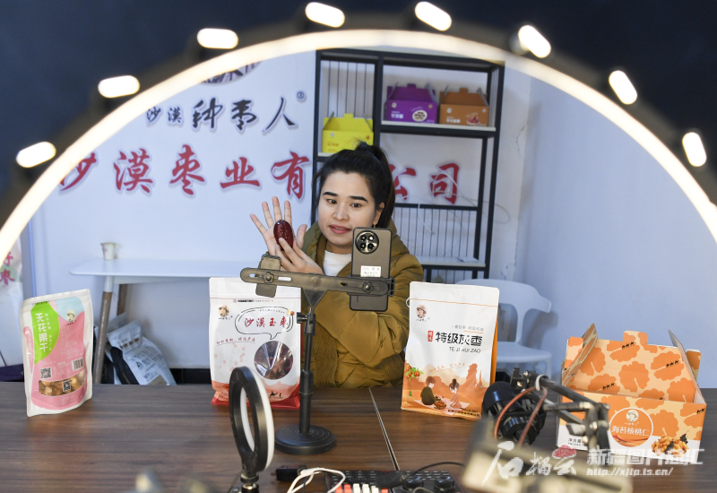 11月29日,策勒縣智慧果業(yè)農(nóng)民專(zhuān)業(yè)合作社員工在直播銷(xiāo)售大棗。