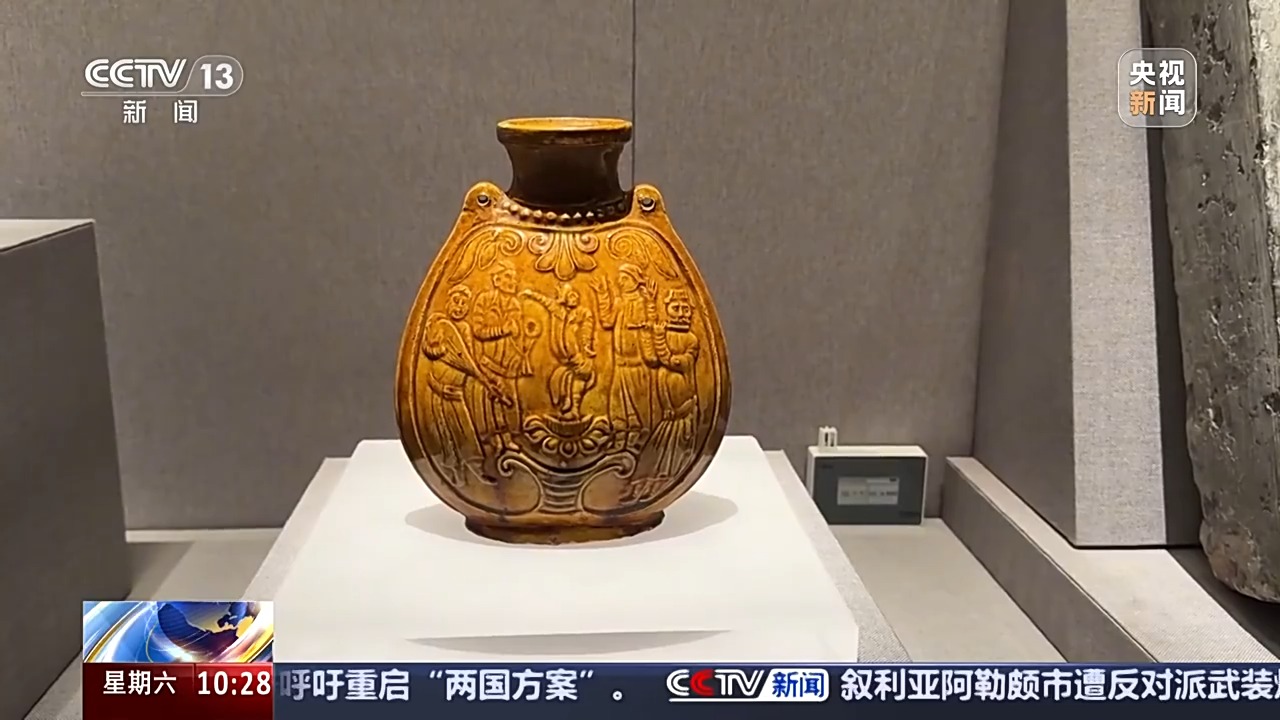 2000多年前,張騫出使西域,絲綢之路得以正式貫通。到了南北朝時期,陶瓷、鐵器等商品,就通過絲綢之路被大量運往西域,胡樂、胡舞也通過絲綢之路進入中原。河南博物院收藏的一件黃釉扁壺,留下了這段時期東西方文化交流的歷史痕跡。