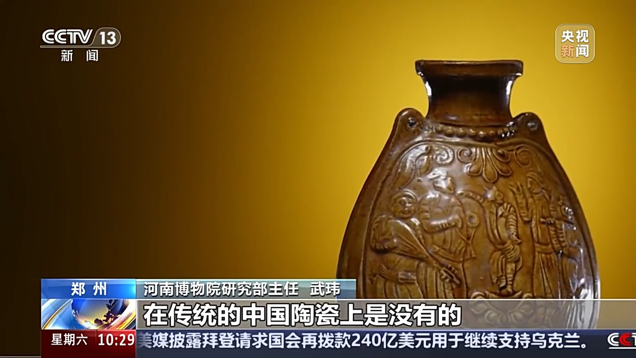 河南博物院研究部主任 武瑋:這種題材實際上在傳統(tǒng)的中國陶瓷上是沒有的。北朝的時期整個社會對它的一種崇尚或者一種喜好,才會出現這樣一個題材,整個中西方的交流在深入發(fā)展。