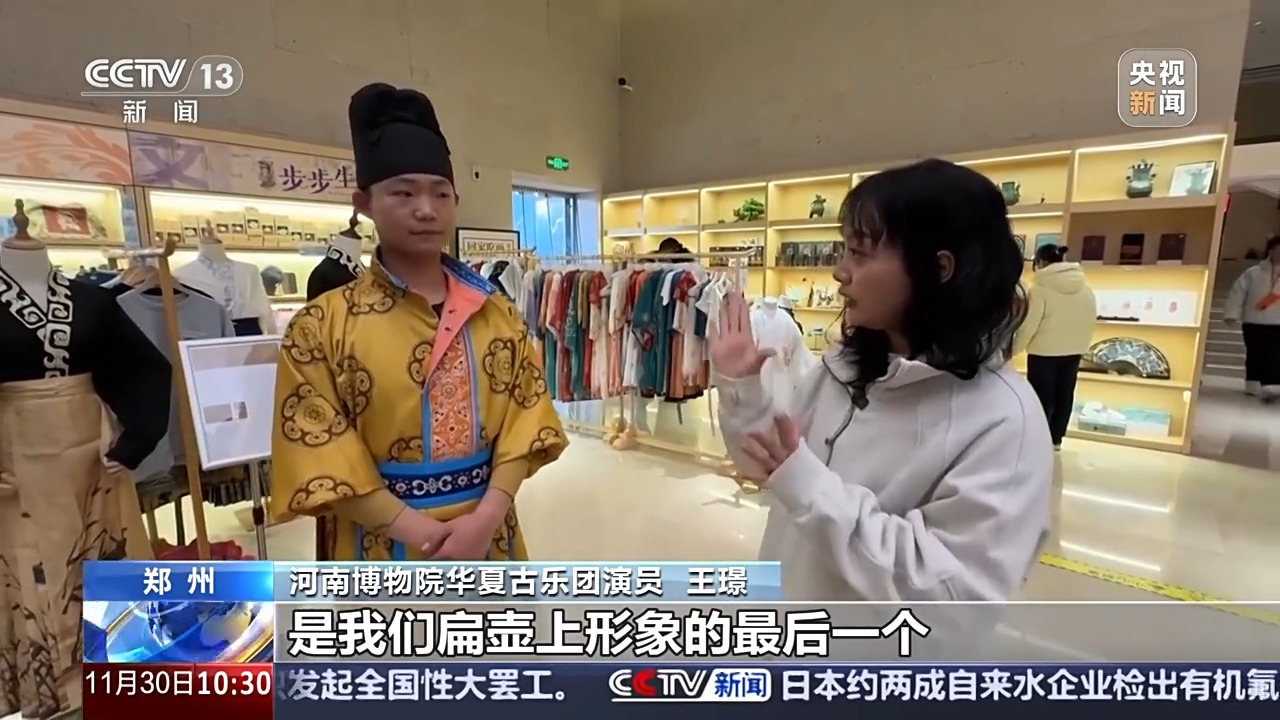 河南博物院華夏古樂團演員 王璟:我們也是依據一些文獻記載,比如說我們有一個動作是提臀動胯,是當時的一個胡人的舞蹈形象。還有揚眉動目是我們扁壺上形象的最后一個。