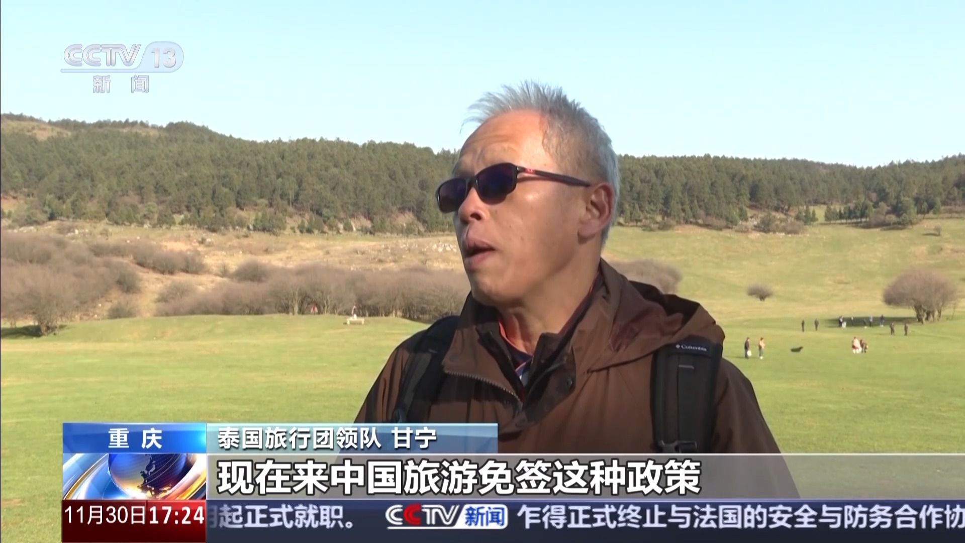 在重慶的著名旅游勝地武隆,各大景區(qū)接待的海外游客數(shù)量明顯增加,這些游客大多來自泰國、新加坡、馬來西亞等國家。29日一大早,重慶武隆仙女山景區(qū)就迎來了來自泰國的旅行團。雖已入冬,仙女山仍然陽光明媚,滿目青翠,遠道而來的游客或欣賞青山綠水,或與草原上的山羊合影,享受愜意時光。