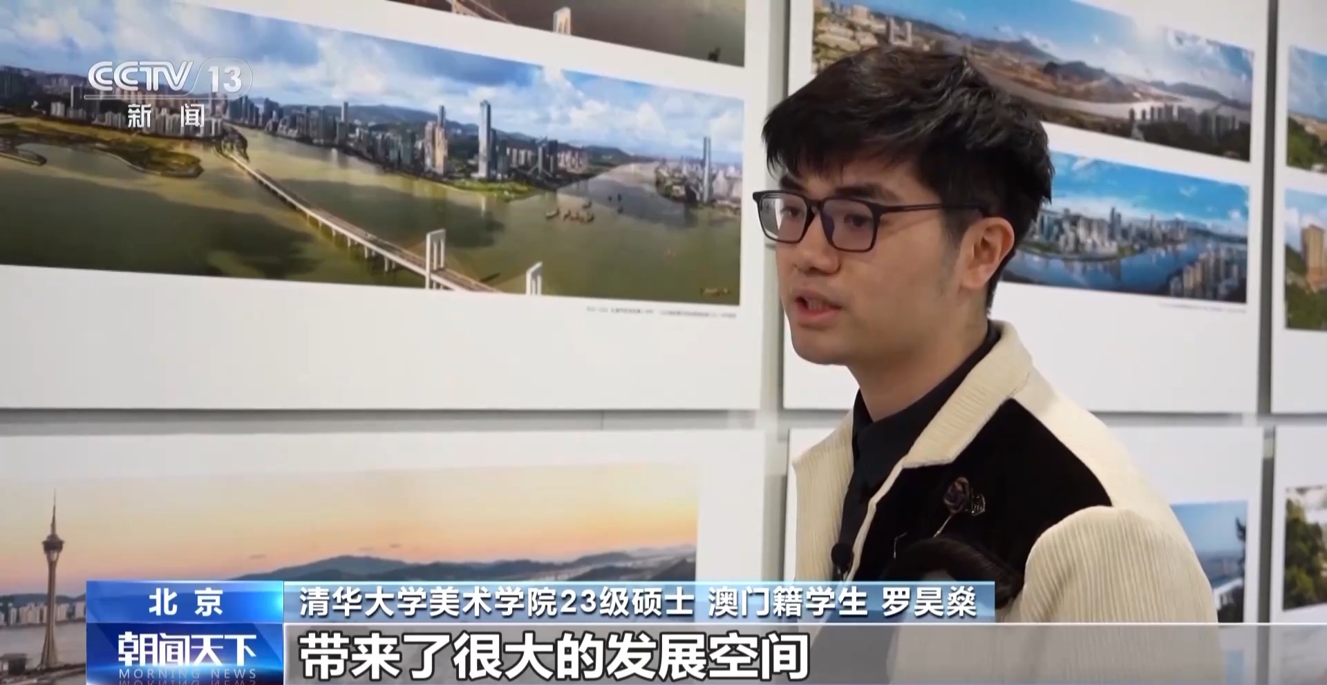 清華大學美術學院23級碩士 澳門籍學生 羅昊燊:我家就在老城區(qū)這塊,從小在這里長大,這么多年還保留了澳門原來的文化色彩。主要是發(fā)展周邊的一些區(qū)域。我也看著周圍從荒蕪空地,發(fā)展成很多高樓大廈。它的建設為我們年輕人帶來了很大的發(fā)展空間。