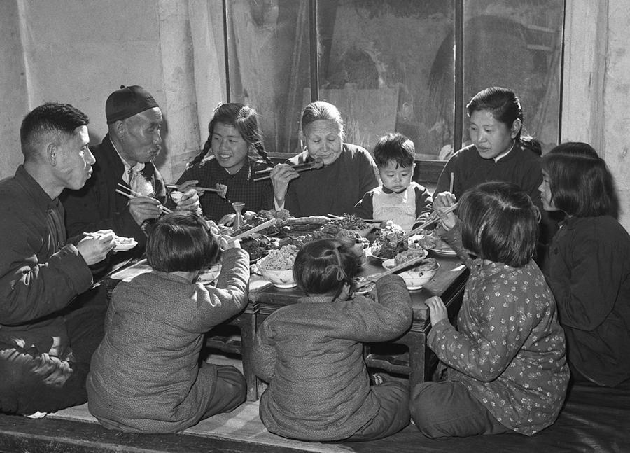 1959年春節(jié),天津居民王德鑄(左一)一家人在吃團(tuán)圓飯。 新華社記者 盛果 攝