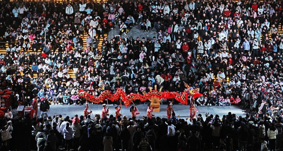 2024年2月12日,游客在山東省臨沂市郯城縣郯國古城景區(qū)觀看舞龍表演。 新華社發(fā)(張春雷 攝)