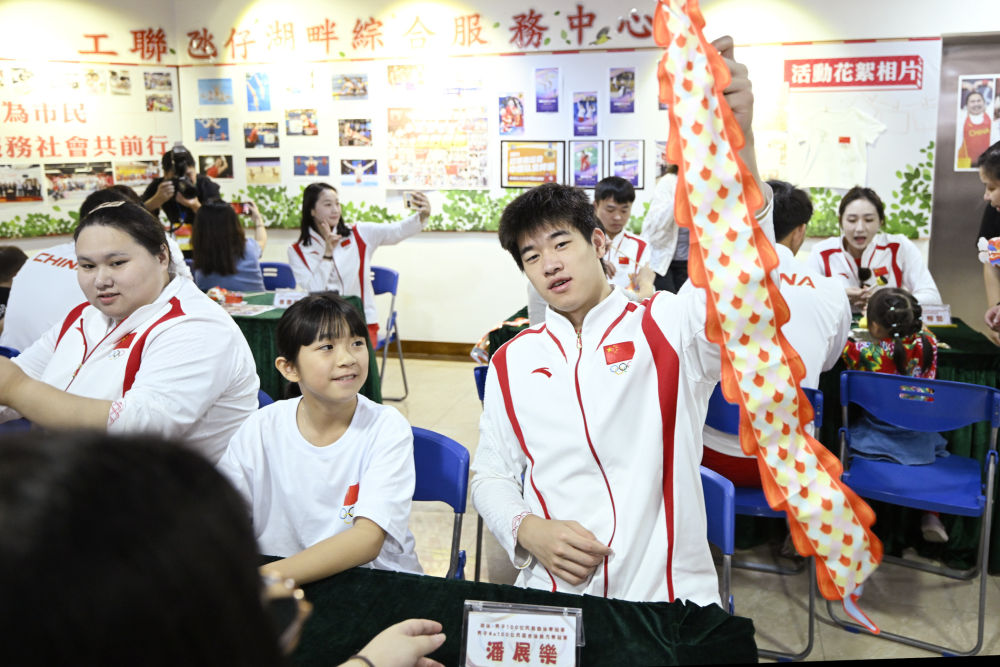 9月2日,在澳門工聯(lián)氹仔湖畔綜合服務(wù)中心,游泳運(yùn)動(dòng)員潘展樂(lè)(右)展示與小朋友一起制作的燈籠。新華社發(fā)