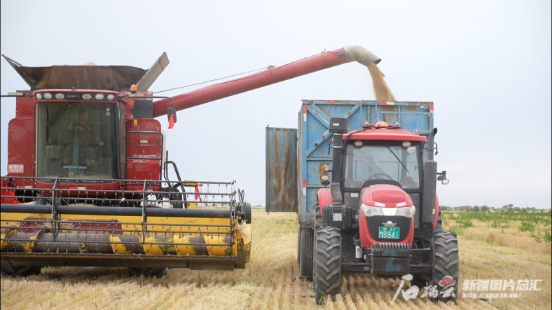 6月5日,喀什地區(qū)麥蓋提縣新疆五征綠色農(nóng)業(yè)發(fā)展有限公司在塔克拉瑪干沙漠邊緣種植的6000余畝冬小麥?zhǔn)斋@場景(資料圖)。買熱古·買買提攝