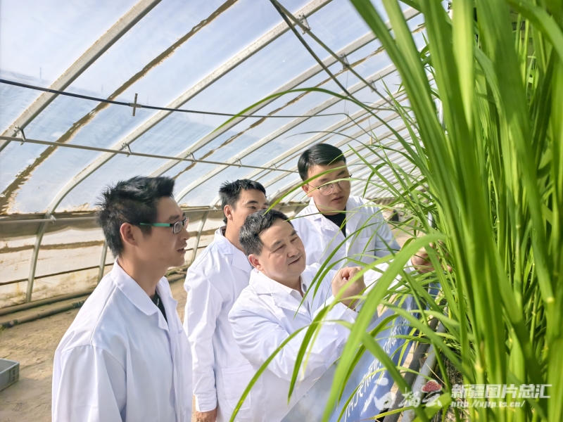 11月20日,和田地區(qū)和田縣萬畝設(shè)施農(nóng)業(yè)基地沙漠溫室水稻種植大棚內(nèi),中國農(nóng)業(yè)科學(xué)院都市農(nóng)業(yè)研究所首席科學(xué)家楊其長團(tuán)隊正在查看水稻長勢。胡禮政攝