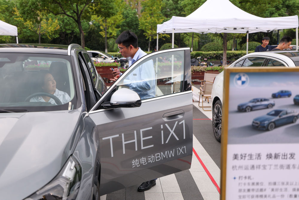 9月27日,經(jīng)銷商(右)在“美好生活 煥新出發(fā)”消費(fèi)品以舊換新展會(huì)現(xiàn)場(chǎng)向消費(fèi)者介紹車輛。(新華社記者 江漢 攝)