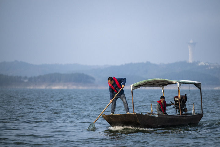 湖北丹江口市清漂隊(duì)隊(duì)長(zhǎng)楊力(左)和清漂隊(duì)隊(duì)員在丹江口水庫(kù)進(jìn)行清漂作業(yè)(2024年10月28日攝)。新華社記者 伍志尊 攝