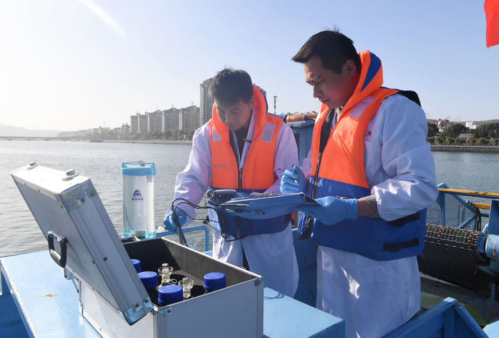 在丹江口庫(kù)區(qū)河南淅川縣鸛河流域城區(qū)段,南陽市生態(tài)環(huán)境局淅川分局工作人員記錄采樣水質(zhì)情況(2024年11月28日攝)。新華社記者 郝源 攝
