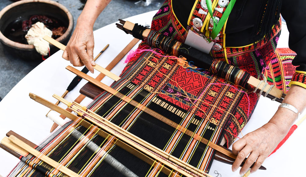 在2023海南錦繡世界文化周非物質文化遺產(chǎn)傳統(tǒng)織繡印染技藝項目精品展上,手工藝人在編織黎錦(2023年4月30日攝)。新華社記者 楊冠宇 攝