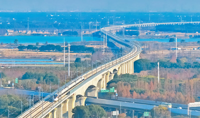 試運行列車駛過滬蘇湖高鐵青浦特大橋金澤橋段。張海峰攝(人民視覺)
