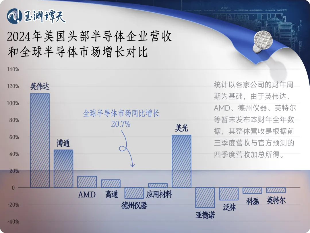 譚主統(tǒng)計(jì)了英偉達(dá)之外美國(guó)營(yíng)收排名前十的芯片企業(yè),發(fā)現(xiàn)其中80%的企業(yè)本財(cái)年的營(yíng)收增速遠(yuǎn)低于全球芯片市場(chǎng)的增速,甚至,有五家企業(yè)今年預(yù)計(jì)都是負(fù)增長(zhǎng)。