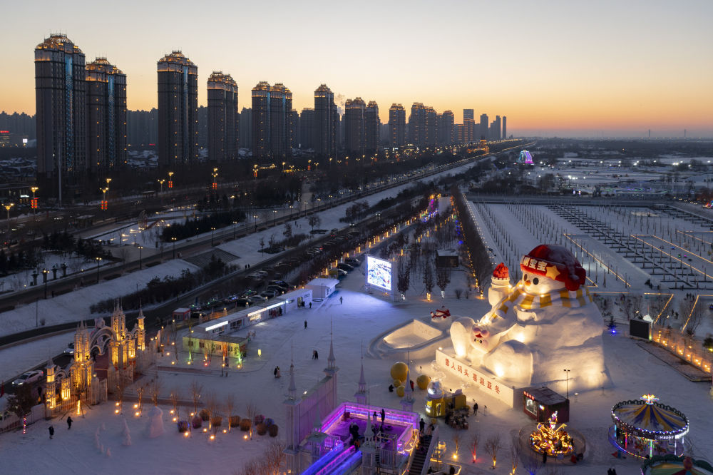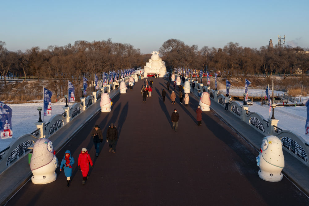 1月3日,游客在哈爾濱群力音樂公園“網(wǎng)紅大雪人”附近游玩(無人機照片)。