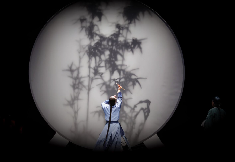 舞臺(tái)上,古琴與琵琶的悠揚(yáng)旋律仿若一陣清風(fēng),輕輕拂開(kāi)歷史的畫卷,清代揚(yáng)州的風(fēng)情萬(wàn)種如詩(shī)如畫般徐徐展開(kāi)。鄭板橋筆下的竹、蘭、石化作他性格的三種特質(zhì),生動(dòng)地展現(xiàn)了為官之德、書生之質(zhì)、為民之心,以及他對(duì)生命價(jià)值的執(zhí)著堅(jiān)守,深深地震撼著每一位觀者的心靈,讓他們沉浸其中,心潮澎湃。