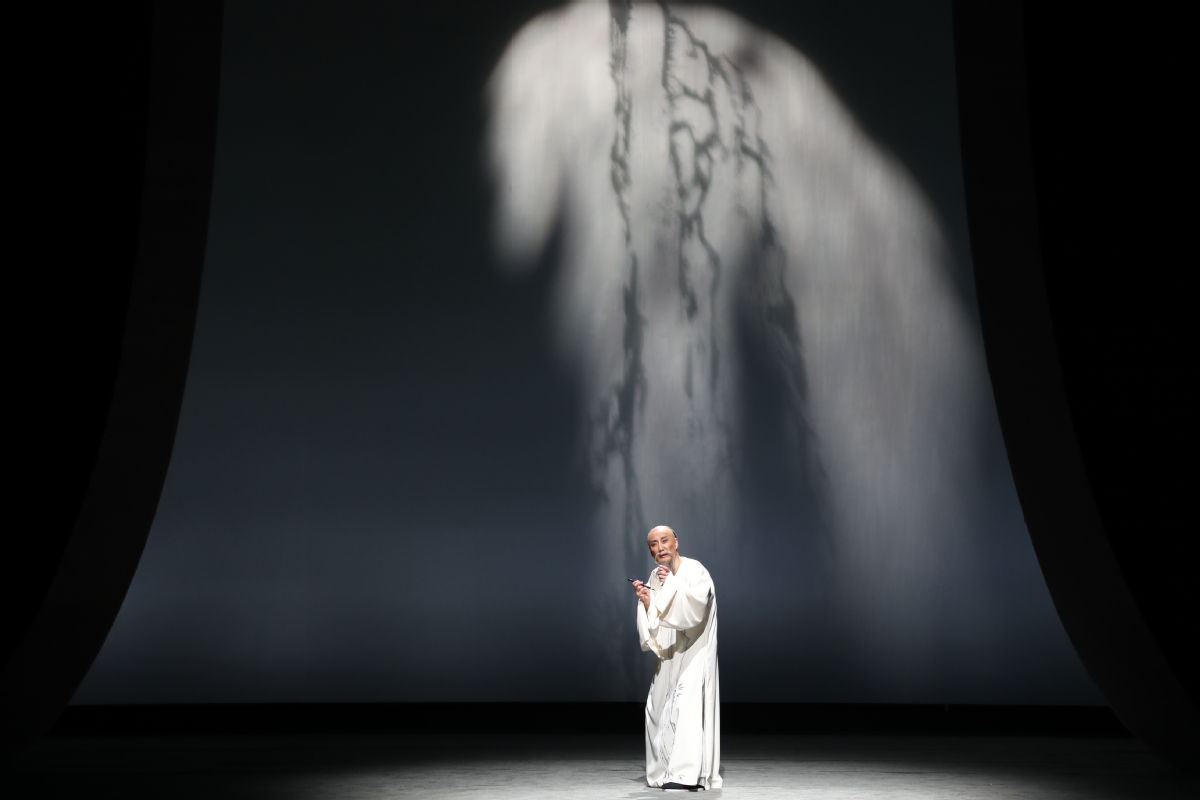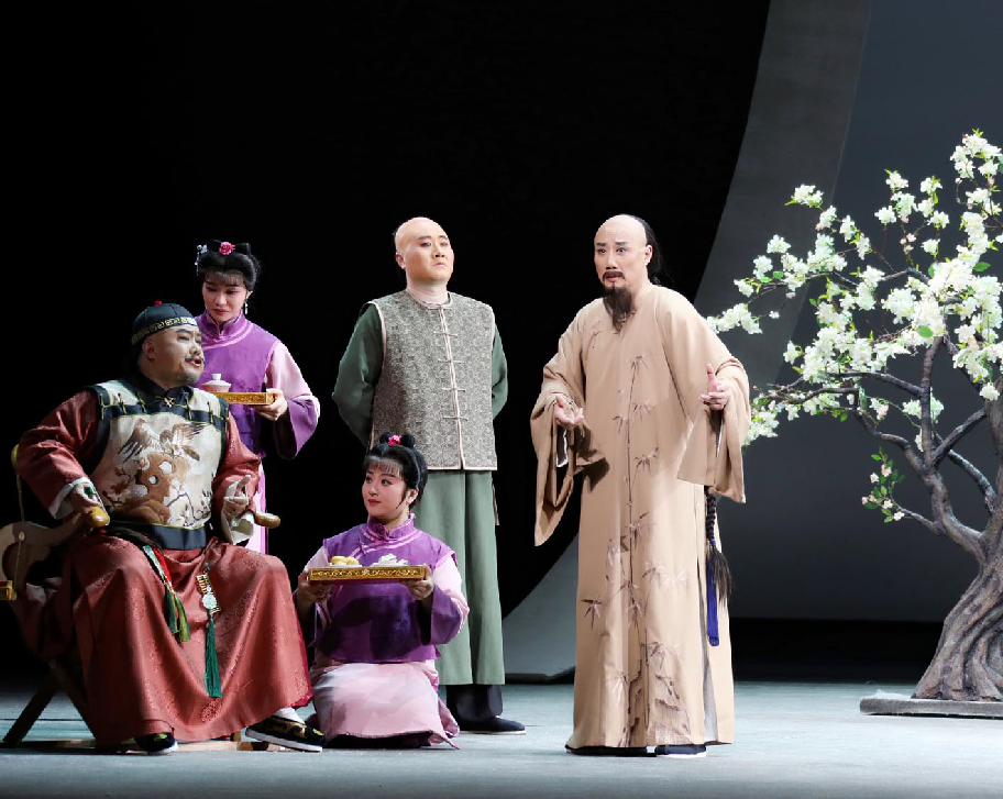 李政成的精湛表演則使創(chuàng)作完美閉環(huán)。在描繪鄭板橋繪畫菊花與蘭花的情景時(shí),他巧妙地采用了文戲武唱的手法,別具匠心地展現(xiàn)了鄭板橋的才華與骨氣。而在劇終部分,長(zhǎng)達(dá)十多分鐘、包含56個(gè)核心唱段的唱腔如波浪般層層推進(jìn),將鄭板橋一生的感悟推至觀眾心底。舞臺(tái)上的清冷視覺(jué)效果與演員熾熱的情感表達(dá)形成了鮮明的對(duì)比,在戲劇的張力中,一個(gè)有溫度、有深度、有情懷的鄭板橋仿佛從歷史中走來(lái),真正“活”了起來(lái)。