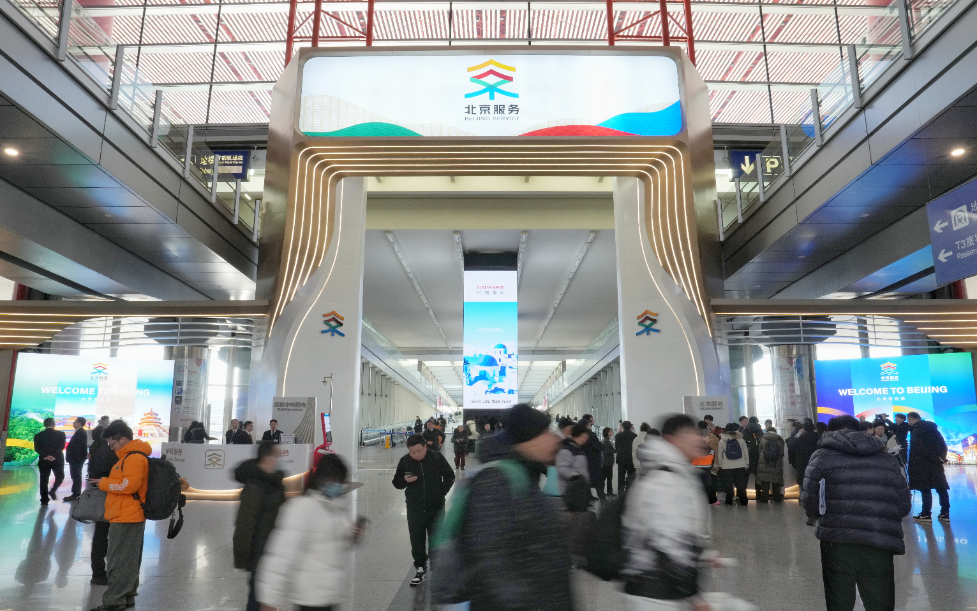 圖為2025年1月8日,在北京首都國際機場T3航站樓拍攝的“北京服務(wù)”機場服務(wù)點。從1月1日起,北京在首都國際機場和大興國際機場的國際到達出口設(shè)立“北京服務(wù)”機場服務(wù)點,為來華、來京外籍人士提供金融、通訊、交通、文旅等四個主題的20余項高頻服務(wù),便利八方來客暢游中國。新華社發(fā) (鞠煥宗攝)