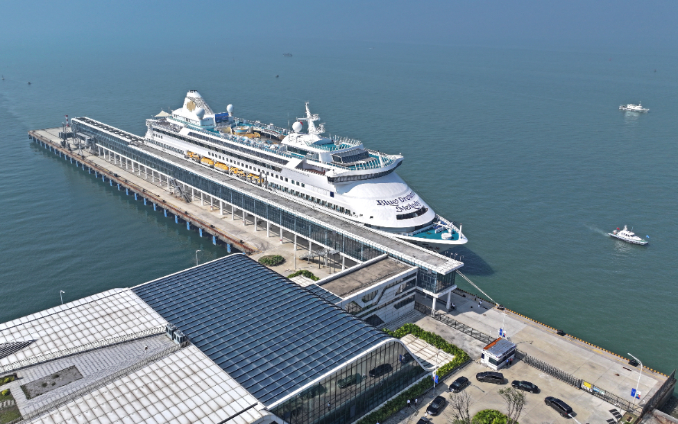 圖為2024年11月15日在北部灣國際郵輪母港拍攝的即將執(zhí)行首航任務(wù)的“藍夢之歌”號郵輪。新華社發(fā)(無人機照片,周華攝)。