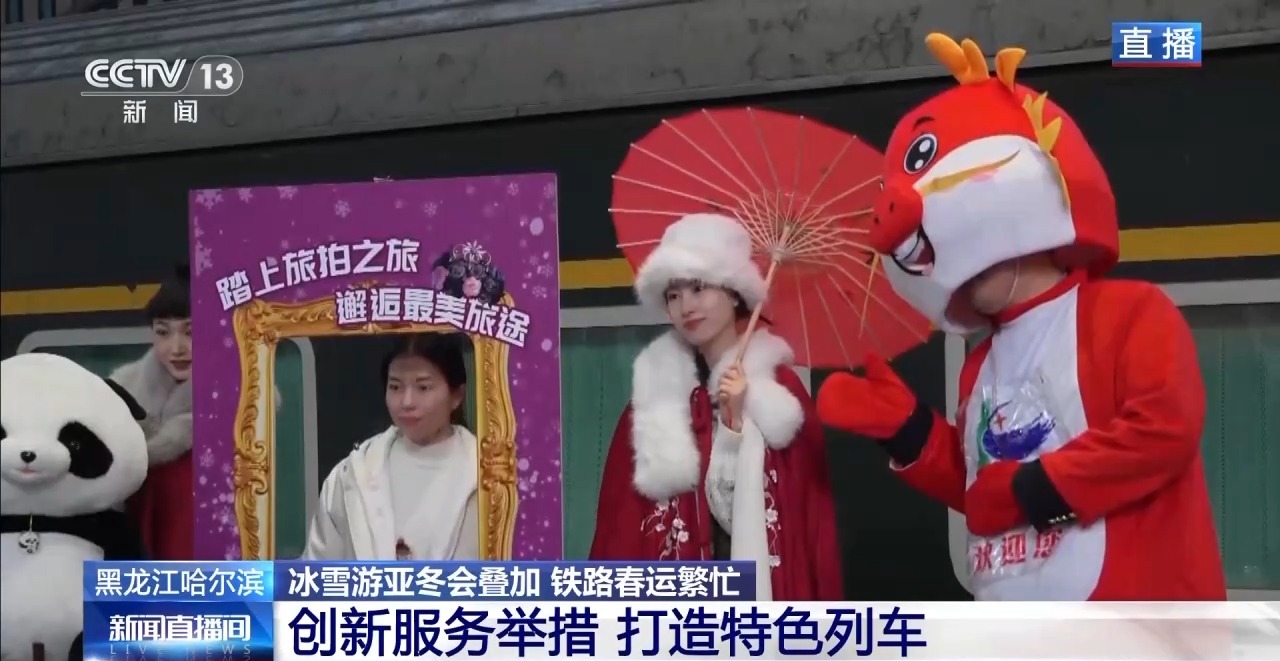 在春運期間,鐵路部門還打造了特色主題列車,比如現(xiàn)在已經(jīng)開通的“旅拍列車”。車上設(shè)置了哈爾濱街景、民俗文化、冰雪奇遇等主題場景,車上還有化妝間、更衣室,可以為旅客提供多種風格的旅拍服飾,旅客可以通過手機小程序進行預約。拍攝人員也是由愛好攝影的鐵路職工組成的旅拍團隊,大家都是利用業(yè)余時間為旅客免費提供服務。