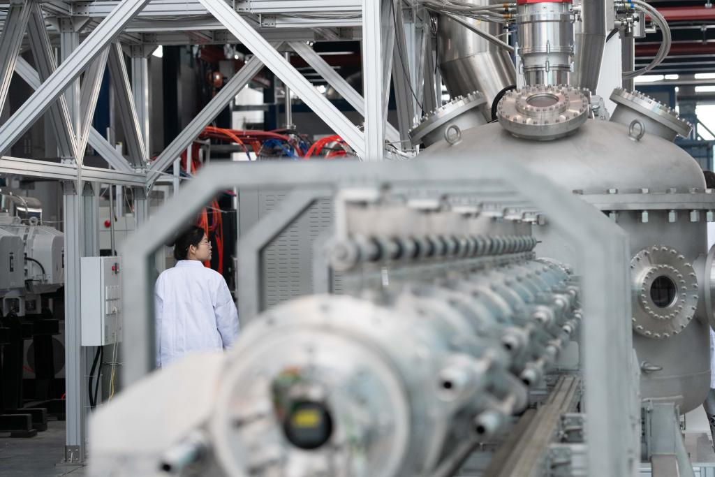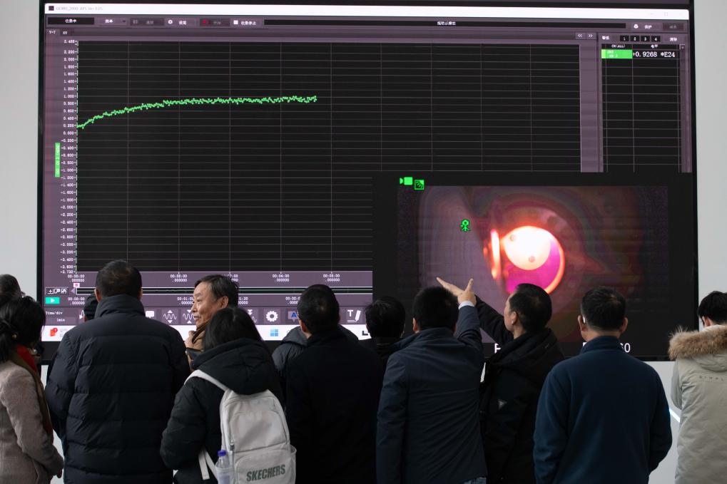 2025年1月14日,科研人員在巡看強流直線等離子體裝置“赤霄”的運行狀態(tài)。新華社記者 張端 攝