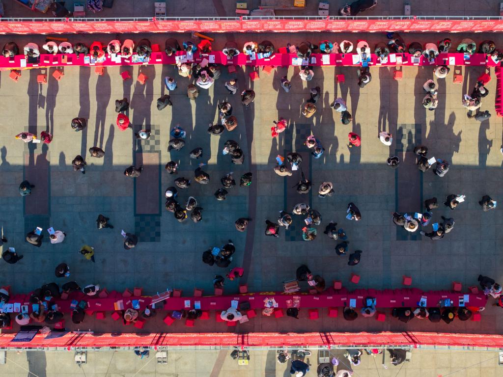 2025年1月15日,求職者在招聘會現(xiàn)場了解招聘信息(無人機照片)。新華社發(fā)(阮雪楓攝)