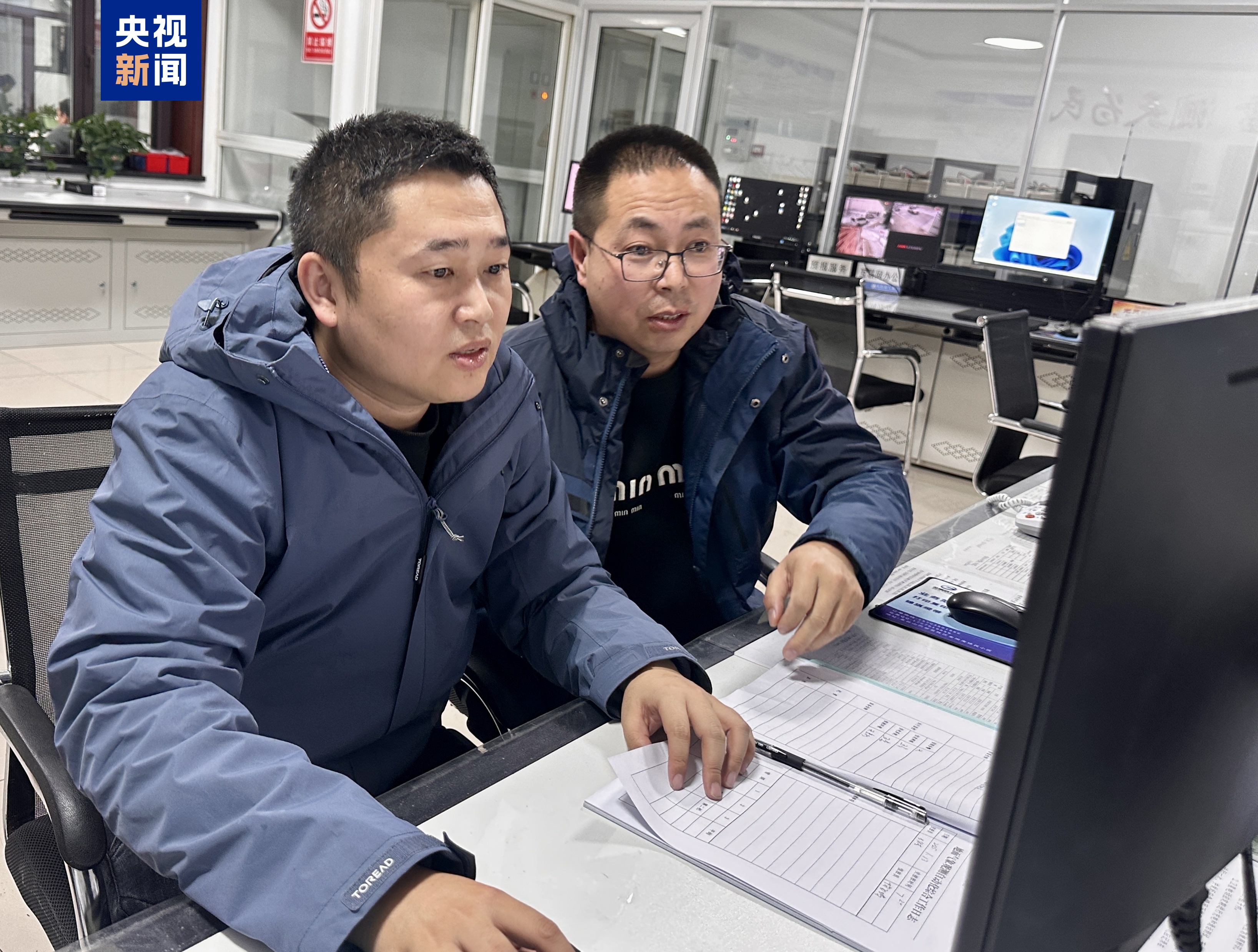 △楊飛鴻(左)與王俊杰(右)查看春運氣象數(shù)據(jù)