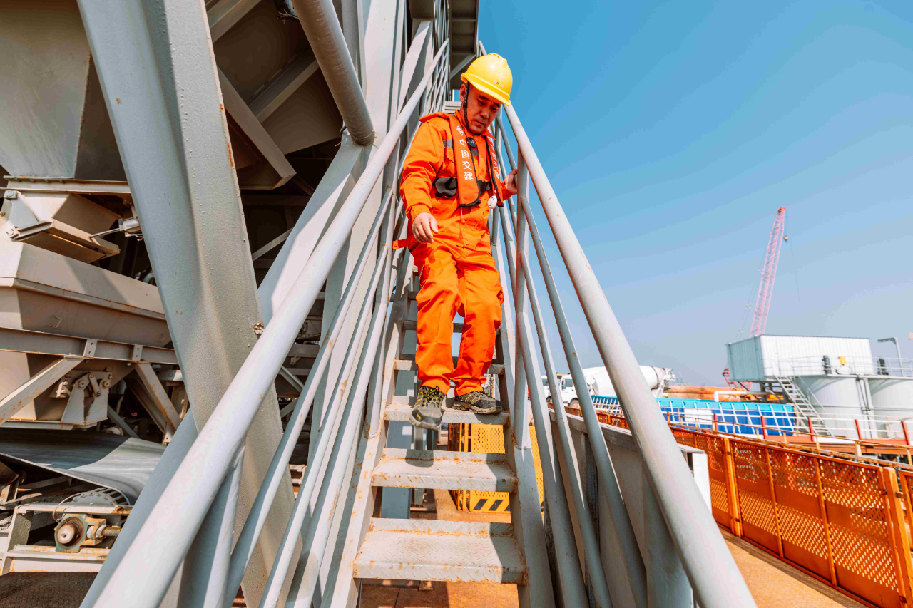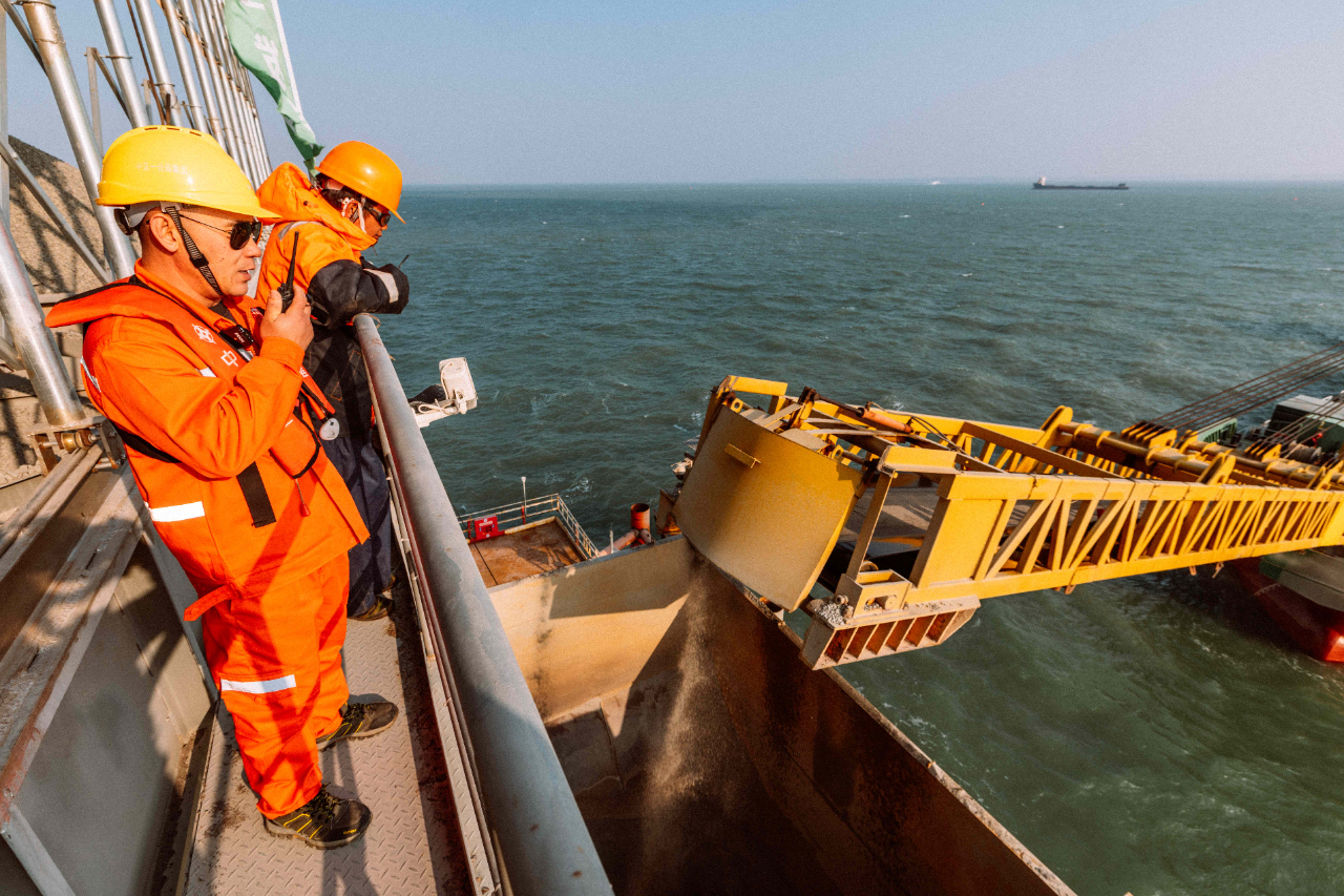 1月17日,夕陽下的廈門劉五店港區(qū),北風(fēng)勁吹。在距離中交一公局集團(tuán)廈金大橋(廈門段)項目海上平臺混凝土操作員梁芝敬站立位置不到30米的洋面上,一艘船身印有“帆順168”字樣的補料船,裝載著4000多噸砂石緩緩抵近。船頭前方延伸出一條25米長的傳送皮帶,將船上的砂料源源不斷地送抵老梁眼前的鋼制固料斗內(nèi)。當(dāng)天他們要趁著海水退潮帶來的作業(yè)窗口,為站里補上700噸機(jī)制砂和900噸粒徑10到20毫米的小石子,以確?;炷琳旧a(chǎn)不停機(jī)。
