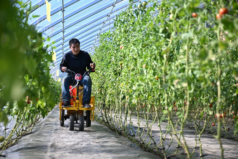在延安市寶塔區(qū)劉興莊村,劉浪浪駕駛農(nóng)機(jī)在大棚內(nèi)運(yùn)送物資。新華社記者 張斌 攝