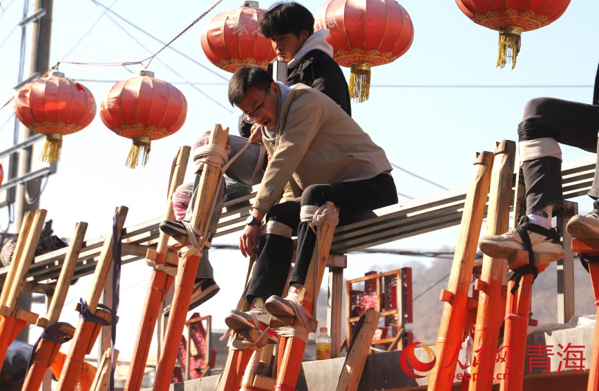 綁蹺、試蹺、定蹺……青海省西寧市湟中區(qū)魯沙爾鎮(zhèn)火神廟,魯沙爾高蹺隊(duì)迎來了春節(jié)前最后一次排練?!皬呐D月初一到現(xiàn)在二十多天了,今年大家積極性很高,報(bào)名的人也多,排練效果不錯(cuò)?!弊龊脺?zhǔn)備,隨著社火音樂的鼓點(diǎn)舞動(dòng)起來,魯沙爾鎮(zhèn)高蹺協(xié)會(huì)會(huì)長(zhǎng)李玉龍站在臺(tái)階上看著排練隊(duì)形。