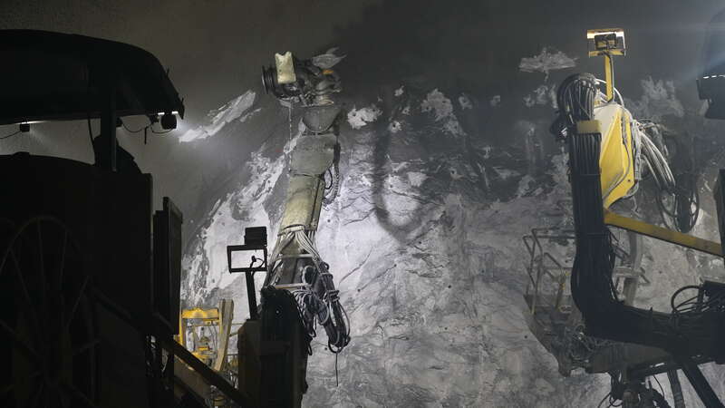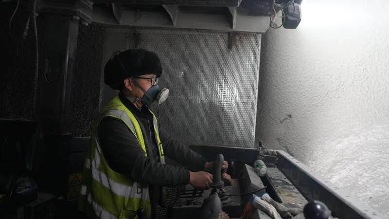 G219線昭溫公路(昭蘇至溫宿)西天山特長隧道內(nèi),施工員操縱機(jī)器作業(yè)。中青報(bào)·中青網(wǎng)記者 陳曉/攝
