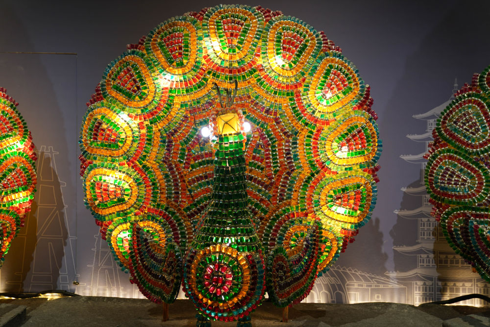 這是在中國彩燈博物館里拍攝的由玻璃藥瓶制作的彩燈“孔雀開屏”(1月18日攝)。