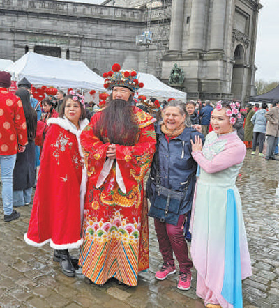 在比利時布魯塞爾舉辦的“中國春節(jié)游園廟會”上,當?shù)赜^眾與廟會演員合影。記者 牛瑞飛攝