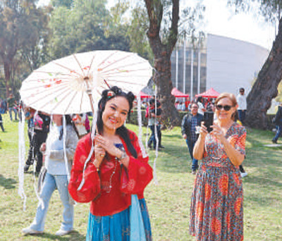 在墨西哥第四屆中國新年文化節(jié)上,當?shù)厍嗄晟碇袊鴤鹘y(tǒng)服飾留影紀念。本報墨西哥分社 埃內(nèi)斯托·多明戈斯攝