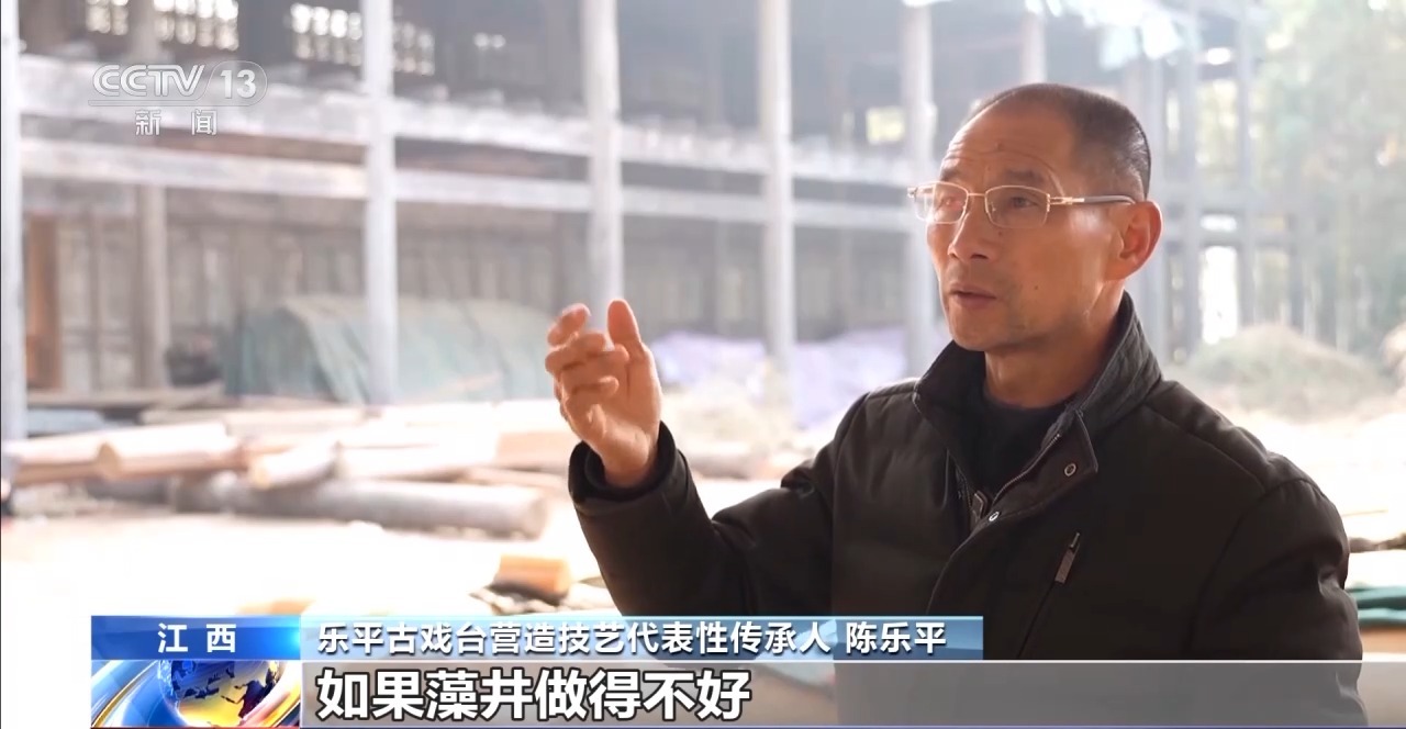 樂平古戲臺營造技藝非遺傳承人 陳樂平:古代人做螺旋頂,做得越好的,回音就響亮。如果藻井做得不好,古代沒有擴(kuò)音器,做得不好回音就回不出來。