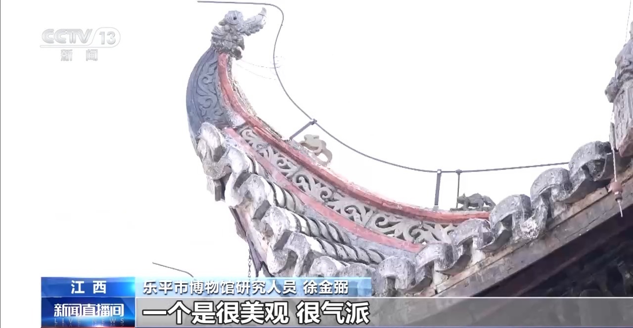 樂平市博物館研究人員 徐金弼:寶頂在古建筑里面一般都有,一個是很美觀、很氣派。它可以避雷,起保護(hù)古建筑作用。戲臺翹角,它有兩個功能,一個防水,一個采光,氣勢恢宏。