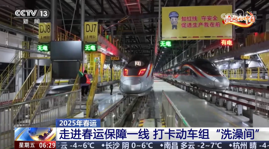 春運期間,旅客平安出行的背后是數(shù)千組奔馳在祖國大江南北的動車組。白天,列車日行千里,而到了午夜時分,它們就進入專屬的“保養(yǎng)驛站”進行必要的清洗工作。從里到外,保潔員們連夜給列車好好地“洗個澡”,確保次日干凈上線。接下來,我們就跟隨記者的鏡頭一起去到江西南昌,打卡高鐵動車組的“洗澡間”。