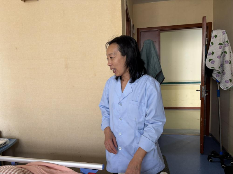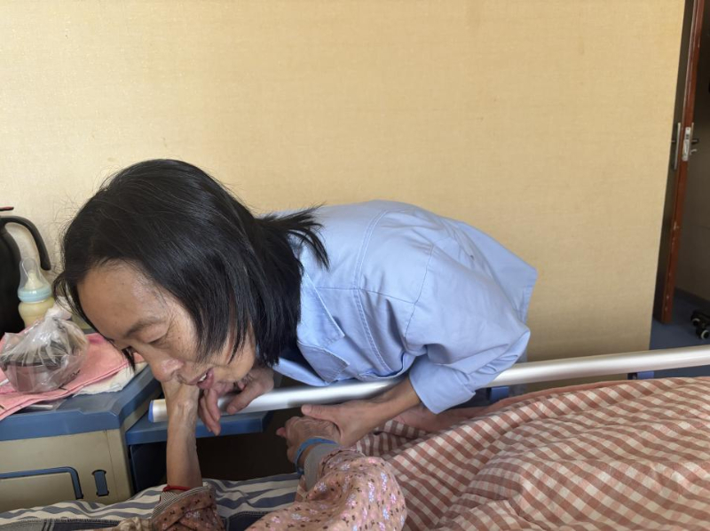 來(lái)自黑龍江省的李世娟,今年55歲,因?yàn)槟昙o(jì)原因本想從事育兒嫂工作的她只能從事護(hù)理工作?!凹艺菊f(shuō)雇主更想要年輕些的阿姨帶孩子?!陛氜D(zhuǎn)之下,她考取了護(hù)工資格證,成為一名老年護(hù)理員?!斑@是我照顧的第二位老人”她輕聲說(shuō)。第一位老人出院時(shí),家屬本想帶她走,她婉拒了,“看著他們好起來(lái)我也高興,但這里總有更需要我的人。”談話間,90床奶奶的兒子來(lái)探望老母親,輕摸著奶奶的頭一遍又一遍地問著“睜眼看看,我是誰(shuí)呀”,奶奶也是含糊不清地說(shuō)著“不知道”,兒子半開玩笑地說(shuō)“傻老太太”。李世娟在一旁緊忙說(shuō):“你不要說(shuō)她傻啊,糊涂啊,因?yàn)榛加邪柶澓DY的人有時(shí)是清醒的,一聽你說(shuō)她傻她就覺得自己好像是傻了”,李世娟向記者說(shuō),自己平日很喜歡看健康教育節(jié)目,見到認(rèn)識(shí)的人也會(huì)多科普幾句,“我姑娘說(shuō),媽你別老給人家上課,我說(shuō)媽那不是上課,只是想把自己知道的分享給人家”,李世娟一邊說(shuō),一邊難掩苦笑。