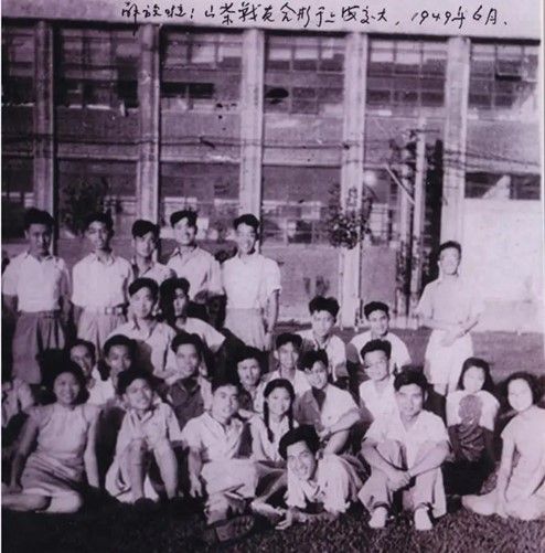 上海解放后,“山茶社”社員在上海交通大學(xué)校園合影,前排臥者為黃旭華。新華社發(fā)