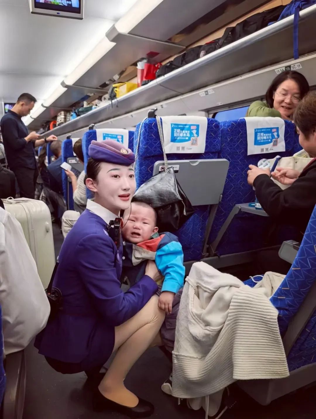 中國(guó)鐵路濟(jì)南局集團(tuán)有限公司青島客運(yùn)段北京動(dòng)車隊(duì)的賈雯乘務(wù)員,耐心地幫助旅客安撫哭鬧的孩子,讓我在新的一年感受到了列車上的溫馨與真情。